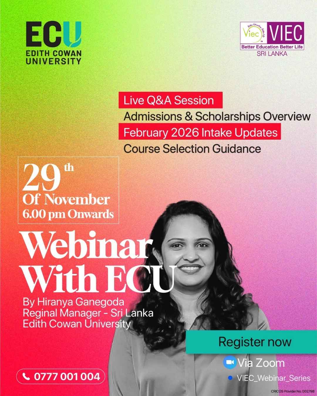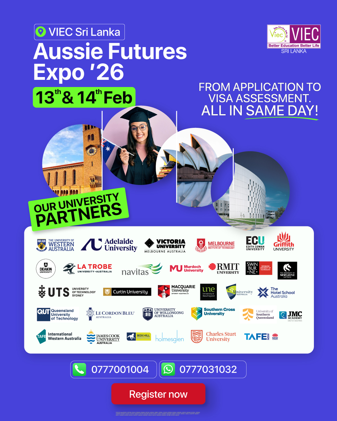 VIEC Sri Lanka No. 7/9, Isipathana Mw, Havelock Town, Colombo 05, colomboAussie Futures Expo โ26 is a dedicated education fair designed to help Sri Lankan students explore their study options in Australia with clarity and confidence. This event brings together top Australian university representatives, experienced study abroad counselors, and IELTS / PTE instructors under one roof, giving students the opportunity to get accurate information, personalized guidance,...